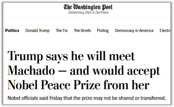 两名接近白宫的匿名消息人士向《华盛顿邮报》爆料,特朗普转变立场的核心原因正是马查多接受了诺贝尔和平奖。